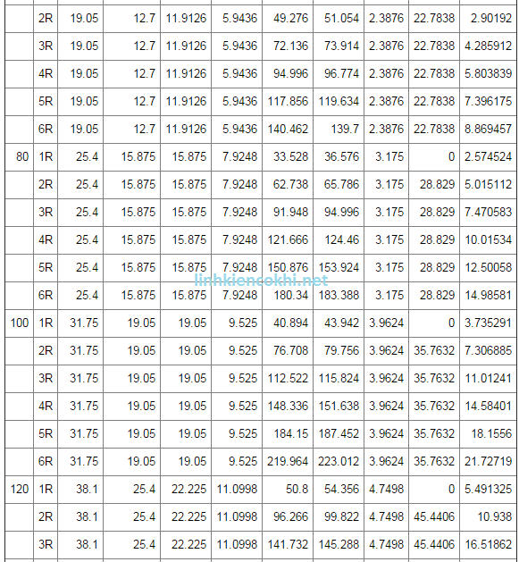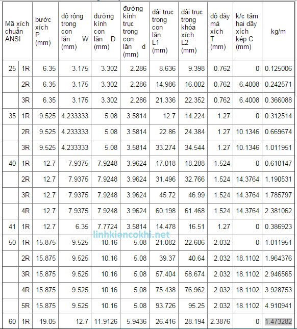 Bảng thống kê các mã xích công nghiệp theo chuẩn ANSI
