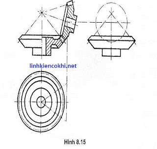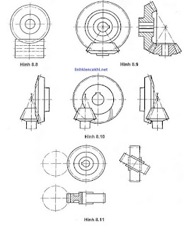 Các quy tắc dùng để biểu diễn bánh răng ở bản vẽ chi tiết cũng được dùng cho bản vẽ lắp. Trên hình chiếu song song với trục bánh răng của cặp bánh răng côn ăn khớp, các đường của mặt chia, bao giờ cũng được kéo dài đến điểm cắt nhau với trục (xem hình 8.9 và 8.l0)ề Giả định rằng một trong hai bánh răng của cặp bánh răng cái này không được che khuất cái kia trong phần ăn khớp (xem hình 8ệ8), trừ hai trường hợp sau:
